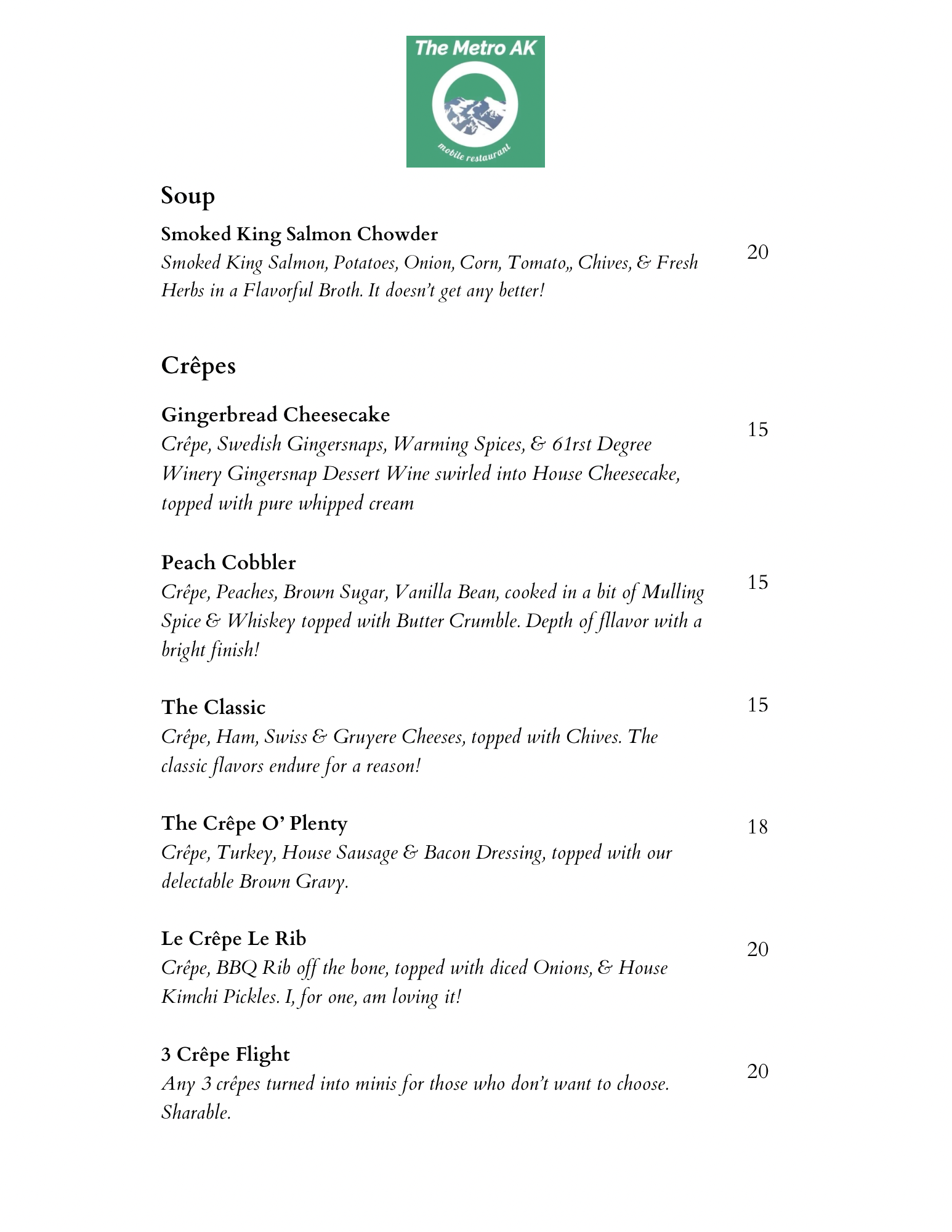 We have a seasonal rotating menu! Listed below are just some of our favorite offerings. New crêpes & soups are created regularly so stay tuned! Note that all crêpes can be made into crêpe-free scrambles. Weekly menu posted here, facebook, & instagram.